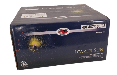 Meet Icarus sun: a self-contained, high-impact display that mixes coloured tails, mines, crowns, glittering effects and piercing whistles. Short, intense and brilliantly balanced. Don't fly too close to the sun — this fanned 130 shot battery delivers non-stop spectacle for up to 90 secs. 🔥✨