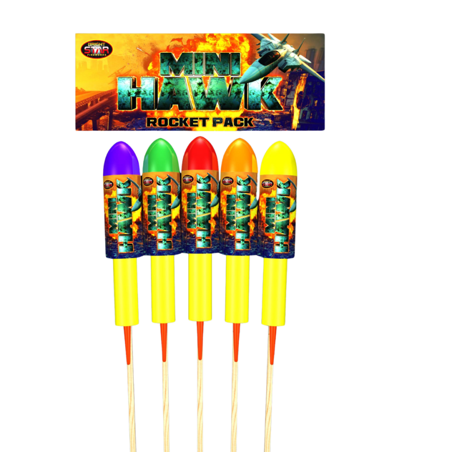 Mini Hawk Rockets deliver compact power and bright colours in a small package. These MINI HAWK ROCKETS are 1.3G. Packs of five dramatic bursts per pack. Perfect for backyard displays and quick celebrations, they are mini but intense and built for high-impact visuals. ✨